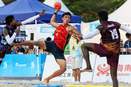 4月21日,在海南三亚举行的第六届亚洲沙滩运动会沙滩手球男子小组赛中,中国队2比0战胜斯里兰卡队。图为中国队球员马会锋(中)在比赛中进攻。