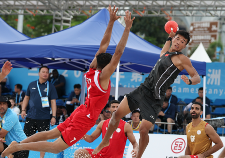 4月21日,在海南三亚举行的第六届亚洲沙滩运动会沙滩手球男子小组赛中,中国队0比2不敌巴林队。图为中国队球员马会锋(上右)在比赛中射门。