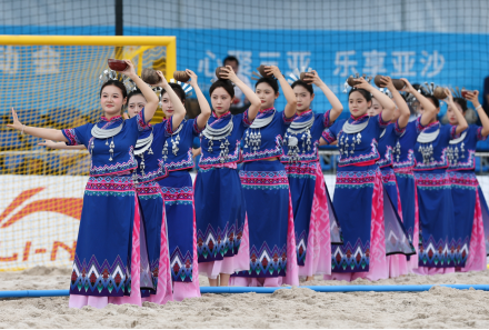 4月21日,第六届亚洲沙滩运动会沙滩手球男子小组赛中,比赛间隙的海南黎族舞蹈表演。