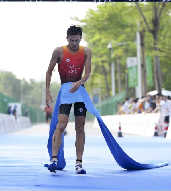虽为“00后”运动员,但范俊杰已是铁人三项赛场上经验丰富的“老将”。去年他在第十五届全运会铁人三项男子个人赛中夺冠,也曾获得铁人三项亚洲杯赛男子组冠军。“在家门口夺得首金,我特别开心。”范俊杰在夺冠后说。