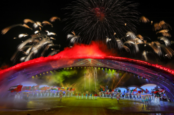 本届亚沙会实现了亚洲45个国家和地区全部报名参赛的“全家福”式团聚。1635名运动员、924名代表团官员和622名技术官员齐聚三亚。开幕式上,各代表团伴随《请到天涯海角来》的旋律,从开放型滨海剧场中“踏浪而来”,呈现出“客从海上来”的独特场景。