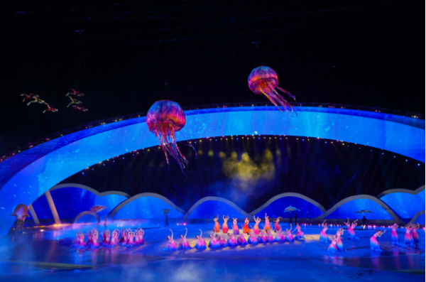 开幕式上,“深海逐梦”篇章将绿色理念推向情感层面。充气水母、儒艮、海龟等海洋生物“游”进演出现场,与观众贴脸互动,直观传递“人与自然和谐共生”的海南态度。焰火表演选用低烟环保烟花,在夜空绽放的同时最大限度降低环境影响。