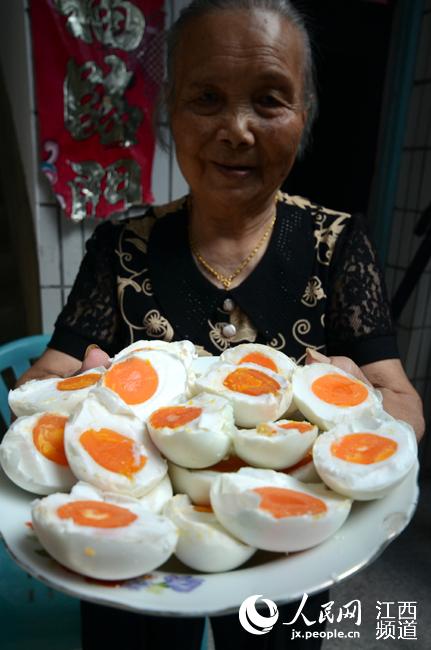 江西瑞金市壬田镇凤岗村,一户普通人家的院子里,几名工人正有序地清洗鸭蛋、倒白酒和黄泥、铺草木灰……头发花白的廖秀英坐在椅子上进行“技术指导”。