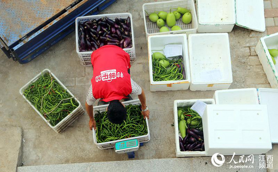 在江西瑞金市华屋村邮政电商扶贫 O2O果蔬收寄点上,物流工作人员正在对村民刚采摘的蔬菜进行称重,这些蔬菜当天中午就能到城里人的餐桌上。
