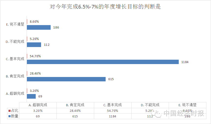 对于今年6.5%-7%的年度增长目标,受访对象认为“肯定完成”和“基本完成”的比重分别为28.4%、54.7%,有3.2%认为会“超额完成”,三者合计达到86.3%。这显示广大居民对实现年度增长目标有充分信心,对保持经济平稳增长有稳定预期。