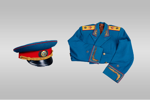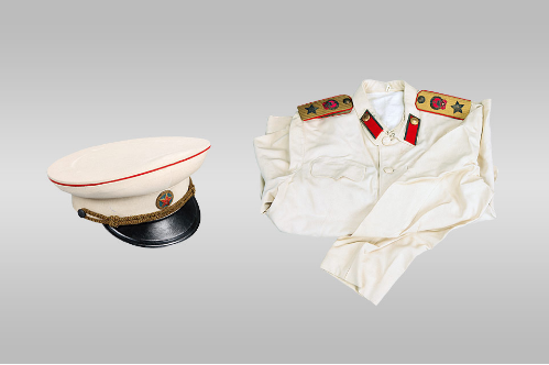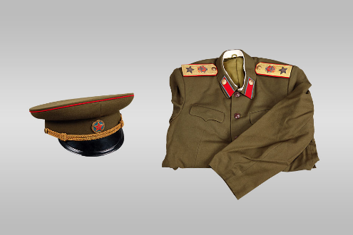朱德穿过的五五式元帅服 年代:1955至1965年质地:五五式元帅礼服:纯毛哔叽五五式元帅棕色常服:纯毛华达呢五五式元帅白色常服:毛凡尔丁