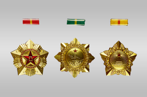 中华人民共和国国防部颁发给朱德的一级八一、独立自由、解放勋章 年代:1955年 尺寸:一级八一勋章:通径6厘米、厚0.5厘米一级独立自由勋章:通径5.8厘米、厚0.5厘米一级解放勋章:通径5.6厘米、厚0.5厘米质地:金