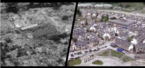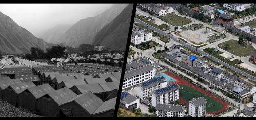 左图:空中看地震后的汶川县映秀镇。 右图:重建后的汶川县映秀镇。