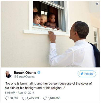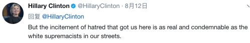 不只奥巴马,美国前国务卿希拉里也发表推文说:“煽动种族仇恨的人应该和游行的白人至上主义者一样受到惩罚。”