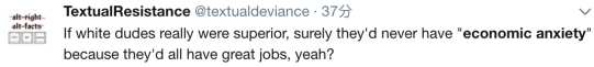 推特网友@TextualResistance: 如果白人真的优秀,那么他们不会存在经济焦虑,因为他们都能找到好工作,不是吗?