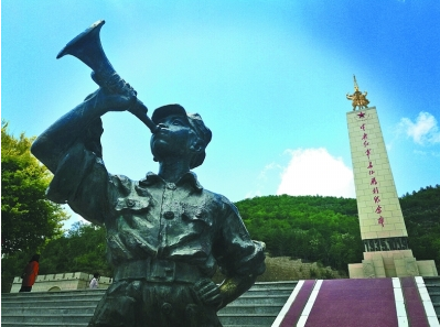 位于陕西延安吴起县的中央红军长征胜利纪念园内的雕塑和纪念碑。光明图片