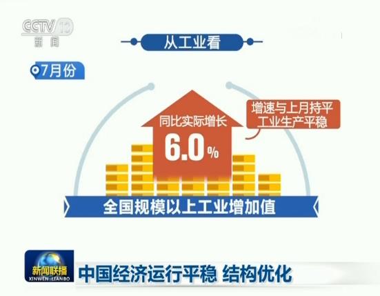 央视网消息(新闻联播):国家统计局今天公布的最新经济数据显示,7月份,我国经济平稳运行,结构继续优化。