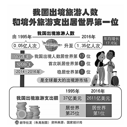 从第一批出国旅游热潮,到第一个黄金周,第一次节假日高速公路免费,到如今,已有70多个国家和地区对中国游客免签证或落地签。2017年,国内旅游市场接待50亿人次,国内旅游收入4.57万亿元,比2012年增长了101.15%,人均出游达到3.7次。中国已经连续多年成为世界第一大出境旅游国,旅游业对国民经济和社会就业的贡献率均超过10%。旅游已经成为我国的战略性支柱产业,成为人民群众重要的文化消费方式。