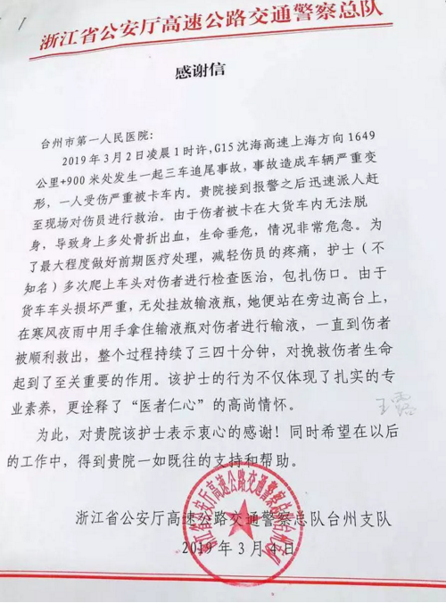 台州高速公路方面因此给医院写来感谢信,让医院找到并表扬一下这位女护士。