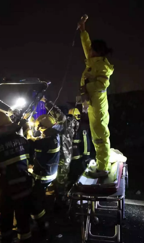 趁着消防官兵和交警队员施救伤员期间,王露一边高举输液瓶,一边从监护仪上观察生命体征变化,一边向医院汇报伤员情况,让急诊待命医生做好抢救准备。整个救援过程持续了40分钟,王露就这样高举吊瓶坚持了40分钟。