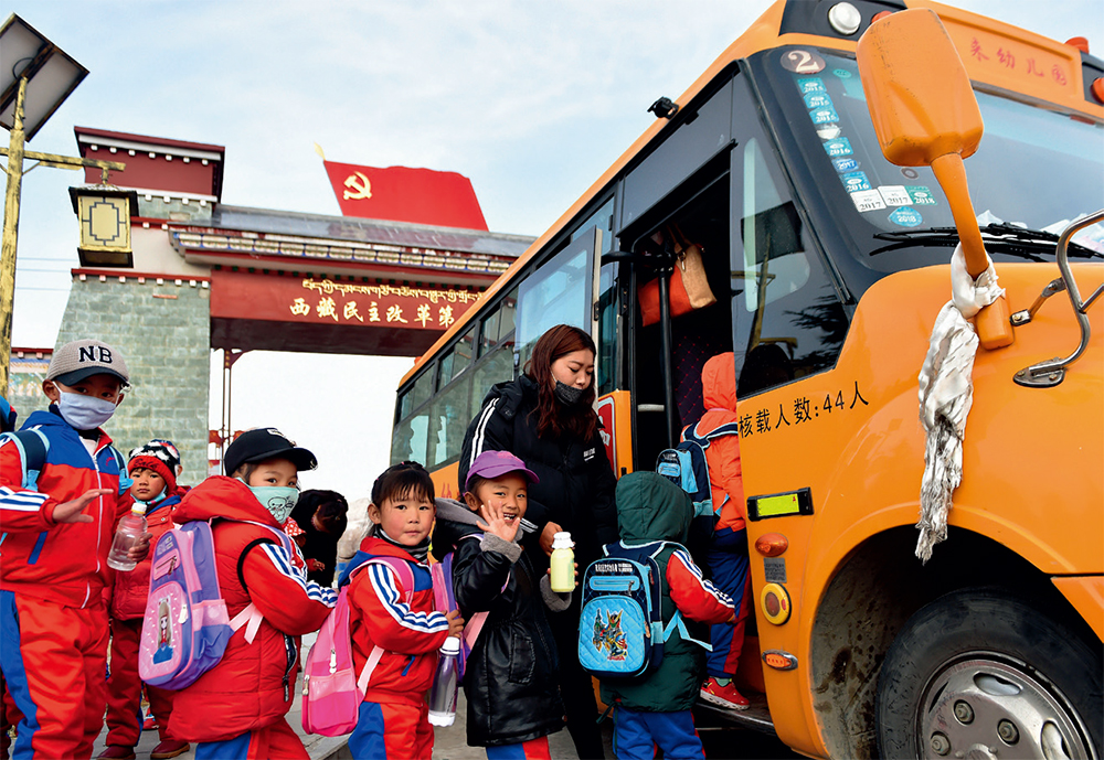 2018年3月27日,“西藏民主改革第一村”克松社区的孩子们登上校车出发去幼儿园 觉果摄