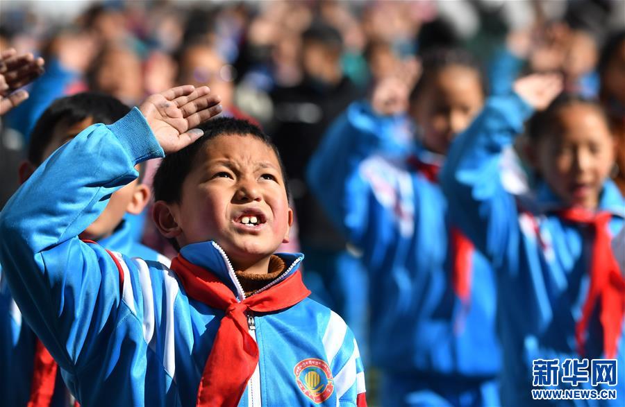 3月4日,在拉萨市第一小学,少先队员在升国旗仪式上向国旗敬礼。新华社记者 觉果 摄