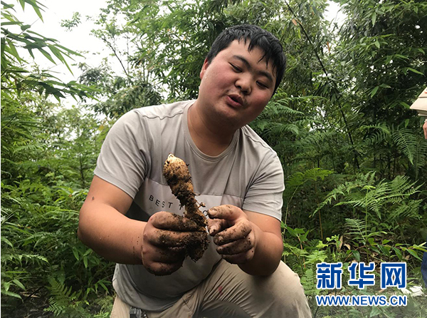 图为彝良县原生态天麻种植专业合作社工作人员杨星明展示移栽后的天麻。新华网 陈颖 摄