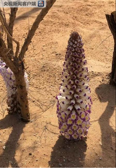 △肉苁蓉的根和花。肉苁蓉是一种寄生在沙漠树木梭梭根部的寄生植物,从梭梭寄主中吸取养分及水分。素有“沙漠人参”之美誉,具有药用价值。(郭玺提供)