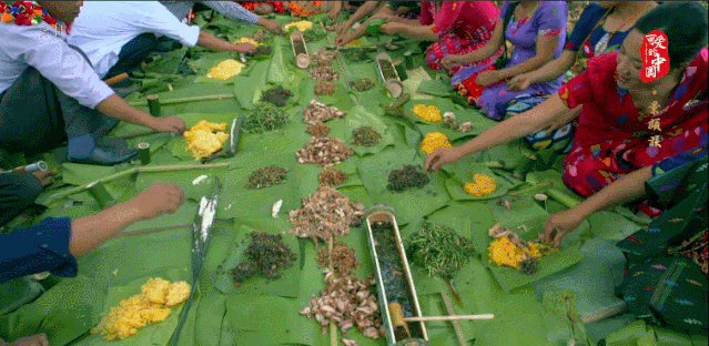 在盛会活动中,除了万人歌舞之外,“绿叶宴”成为盛会中必不可少的重要环节。“绿叶宴”是景颇山寨中传统的特色名宴,其原材料均来自于当地极为丰富的天然动植物,桌上没有碗筷餐具,都用绿叶代替。其中舂菜、鬼鸡、烤肉等菜品,成为惊艳众人味蕾的佳肴。