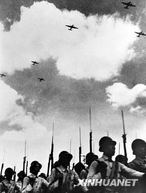 中国人民解放军受阅部队列成方阵,迈着威武雄壮的步伐,由东向西分列式通过天安门广场。与此同时,刚刚组建的人民解放军空军战斗机、轰炸机,凌空掠过天安门广场,接受检阅。