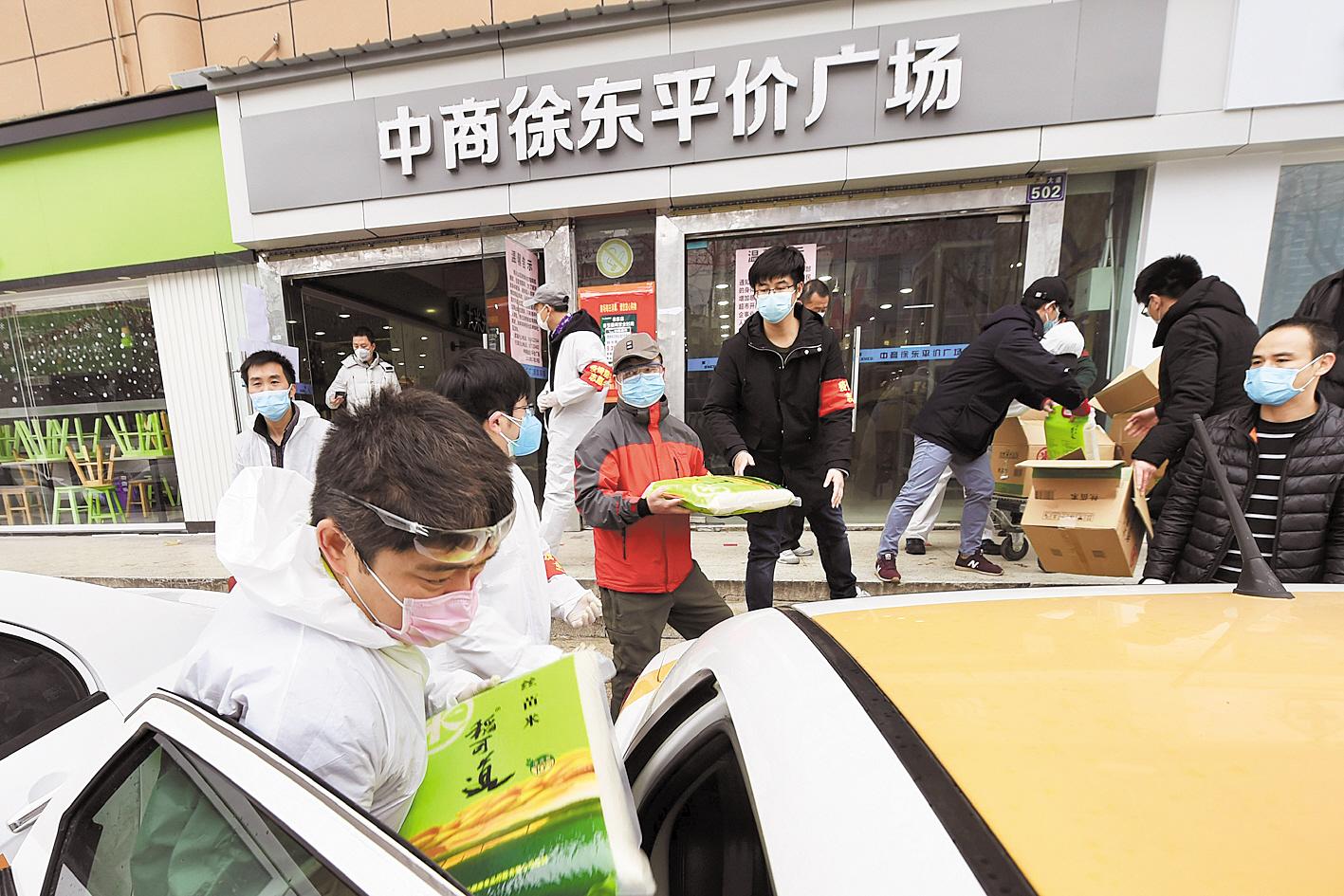 2月21日,位于武汉市武昌区友谊大道的中商徐东平价广场,网约车司机在超市工作人员的配合下忙着搬运社区居民团购的米面油等生活物资,及时运送到居民小区。 (湖北日报全媒记者 李溪 摄)