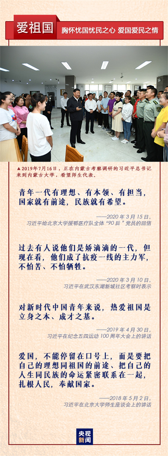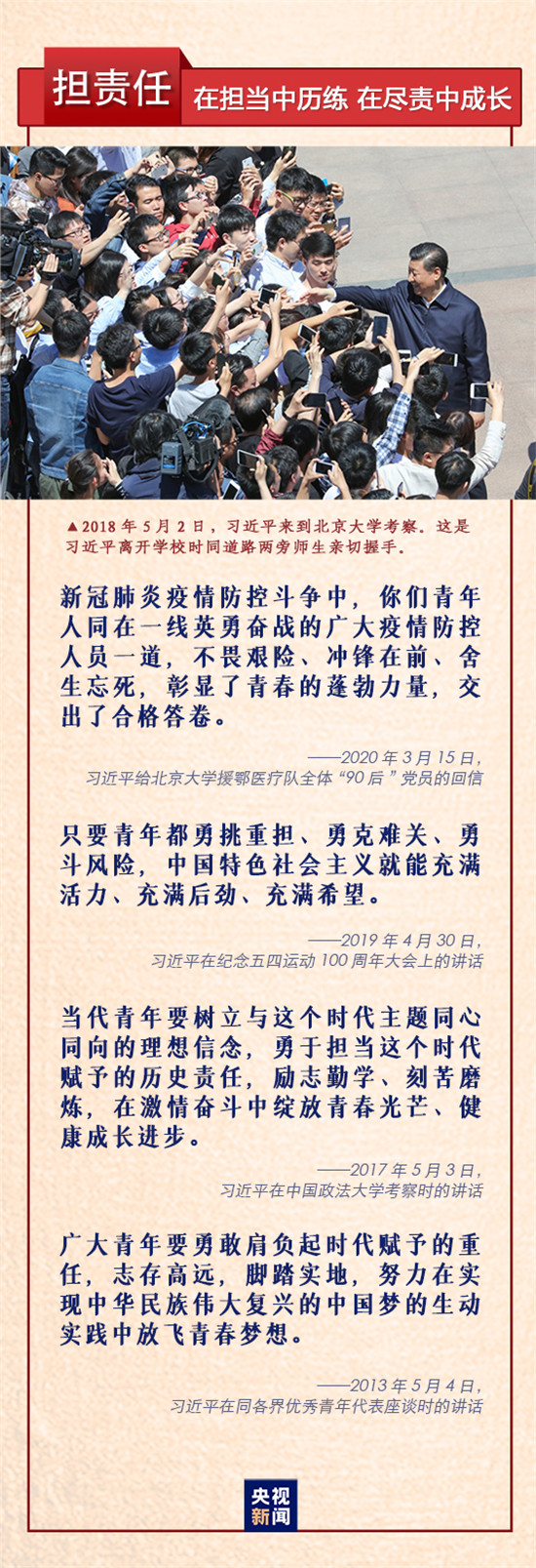 “树立远大理想”“热爱伟大祖国”“担当时代责任”“勇于砥砺奋斗”“练就过硬本领”“锤炼品德修为”,习近平总书记在纪念五四运动100周年大会上对新时代中国青年提出六点希望,激励广大青年不惧风雨、不畏险阻,在实现中华民族伟大复兴中国梦的进程中不断开拓创新、奋发有为。