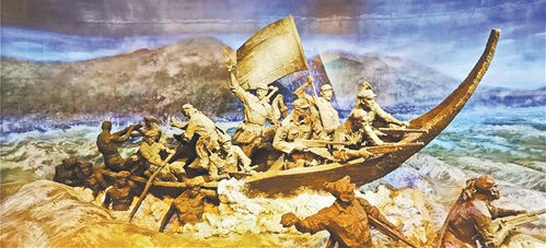 5月的大渡河已进入汛期,河面宽达300多米,河水拍打着密布巨大岩石的河床,发出轰隆隆的怒吼声。25日清晨,在刘伯承、聂荣臻亲自指挥下,红一团一营营长孙继先率领 17名勇士乘坐一只小舟劈波斩浪,冒着枪林弹雨冲向敌阵,成功强渡大渡河,为红军打开一条通向胜利的道路。