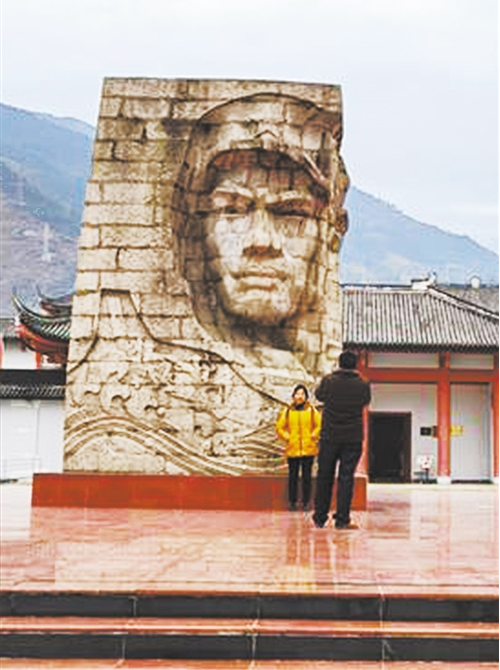 在四川石棉县安顺场中国工农红军强渡大渡河纪念馆前的广场上,两位游客在与红军强渡大渡河纪念碑合影。