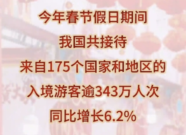 首个“非遗版”春节,普天同庆,五洲同春。“来华体验中国年”,是其中一道动人的风景。中国的高铁上、景区里,时常可见外国游客的身影。数据显示,今年春节假日期间,我国共接待来自175个国家和地区的入境游客逾343万人次,同比增长6.2%。
