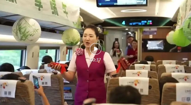 在厦门北开往北京南的G326次、福州南开往广州东的G3043次、福州开往南京南的G1672次列车上,粽子、香囊等挂件装饰在车厢各处,乘务员与旅客们一同参与包粽子、编五彩绳。从厦门北乘车前往南平市的吴平先生兴奋地表示:“我还是第一次在福建乘坐这种具有‘中国风’的主题列车。”