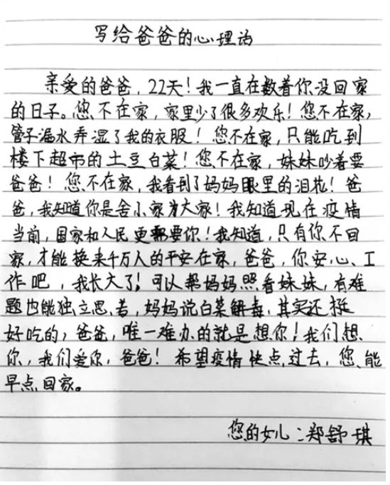 亲爱的爸爸,22天!我一直在数着你没回家的日子。您不在家,家里少了很多快乐!您不在家,管子漏水弄湿了我的衣服!您不在家,只能吃到楼下超市的土豆白菜!您不在家,妹妹吵着要爸爸!您不在家,我看到了妈妈眼里的泪花!爸爸,我知道你是舍小家为大家!我知道现在疫情当前,国家和人民更需要你!我知道,只有你不回家,才能换来千万人的平安在家。爸爸,你安心工作吧,我长大了!可以帮妈妈照看妹妹,有难题也能独立思考。妈妈说白菜解毒,其实还挺好吃的,爸爸,唯一难办的就是想你!我们想你,我们爱你,爸爸!希望疫情快点过去,您能早点回家。