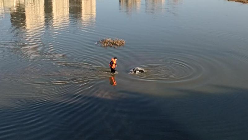 消防救援人员进入水中向被困者靠近,查看被困者的生命情况,被困人员能动弹但无法自救。消防员将被困男子拉到浅水区,将身上的救生衣脱下给被困者穿上,在另一名队员的协助下,一起将被困男子抬到岸边。