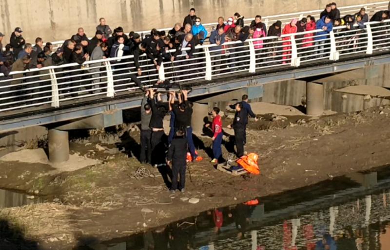 经过近10分钟的紧张救援,落水男子被成功营救上岸,没有生命危险。消防员将该男子固定到担架上,在民警的协助下拉至两米多高的桥面上,送上120急救车。