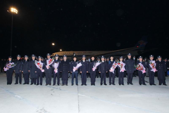 15日凌晨3时许,刚刚迎来入冬初雪的吉林省省会长春,两架民航客机刺破夜幕,先后降落在龙嘉国际机场,在停机坪等候战友凯旋的吉林省公安厅刑侦局局长岳喜田,长春市公安局党委委员、副局长刘省伦和有关城区公安分局负责同志立即走上前去,向从弦梯走下来的全副武装的英雄战友们敬献鲜花,同他们紧紧握手……