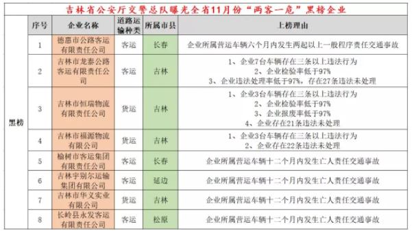 近日,吉林省公安厅交警总队依据《全省道路运输企业交通安全“红黑榜”制度》从11月份筛选梳理了全省8家黑榜企业。
