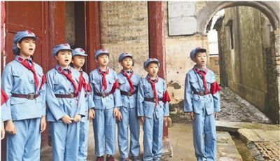 广东南雄市油山镇大塘中心小学学生在徐氏宗祠前齐唱《当红军歌》。本报记者 林小溪摄