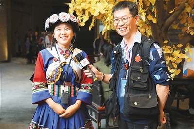 华文媒体代表(右)在体验用VR全景展现的纳西史诗《创世纪》后,对纳西族工作人员进行采访。杨浩明摄