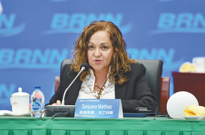 图为2019年4月23日,圣胡安娜·马丁内斯在“一带一路”新闻合作联盟首届理事会议开幕式上发言。翁奇羽摄