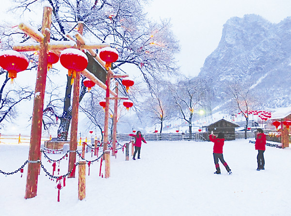 走进坡口村,展现在眼前的是一栋栋崭新整洁的民房和洁净平展的乡路。近处,有头戴红花的老黄牛、与白雪相互映衬的大红灯笼、古色古香的木屋建筑;远处,白雪覆盖下的梯田垄沟有如雕刻的版画,陡峭的远山更如同一幅绣纱幔帐,与村景融为一体,浑然天成。