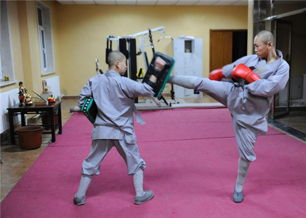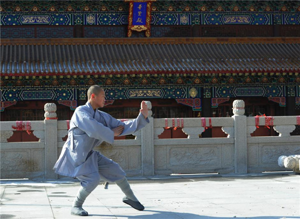 2月17日,在长春市万寿寺内,思慈与思律两位“00后”小武僧,在师父的指导下苦练武功。据了解,万寿寺是吉林省唯一有武僧的寺庙,思慈与思律每天除正常诵经以外,大部分时间都用于练功习武。 张瑶 摄