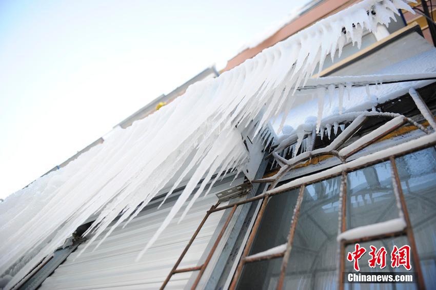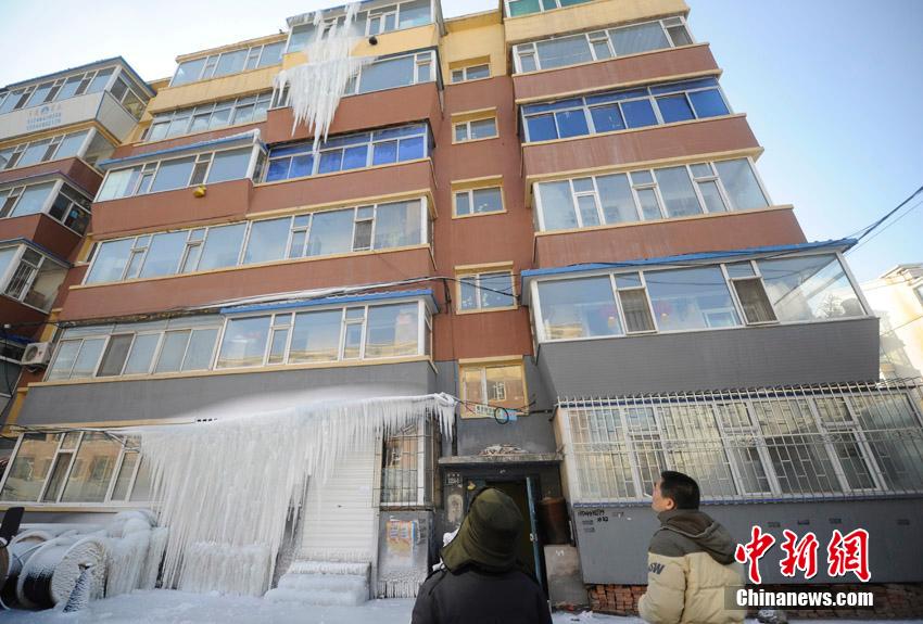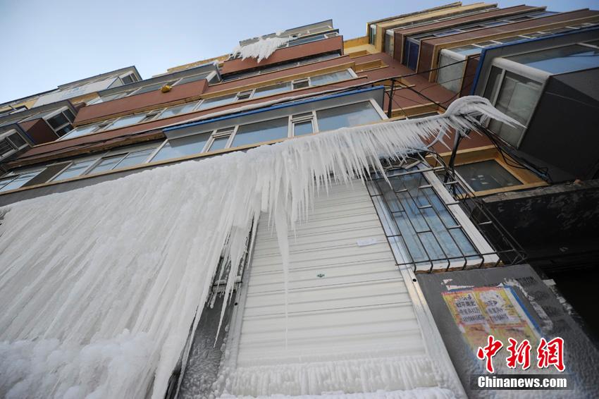 近几日,在长春市一小区居民楼外墙上出现一片巨大的冰瀑,顶楼和一楼住户家的阳台、台阶和地面上都被一层厚厚的冰所覆盖。据附近居民讲,这片冰瀑是因楼顶太阳能热水器漏水,凝结所致。图为顶楼外墙悬挂着长长的冰瀑,十分危险。 张瑶 摄