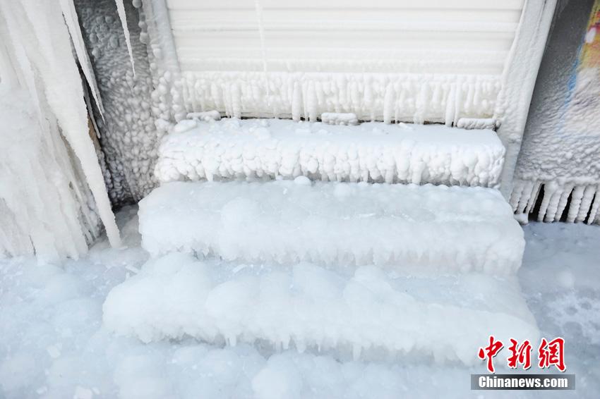 近几日,在长春市一小区居民楼外墙上出现一片巨大的冰瀑,顶楼和一楼住户家的阳台、台阶和地面上都被一层厚厚的冰所覆盖。据附近居民讲,这片冰瀑是因楼顶太阳能热水器漏水,凝结所致。图为一楼住户家的台阶已被一层厚厚的冰所覆盖。 张瑶 摄