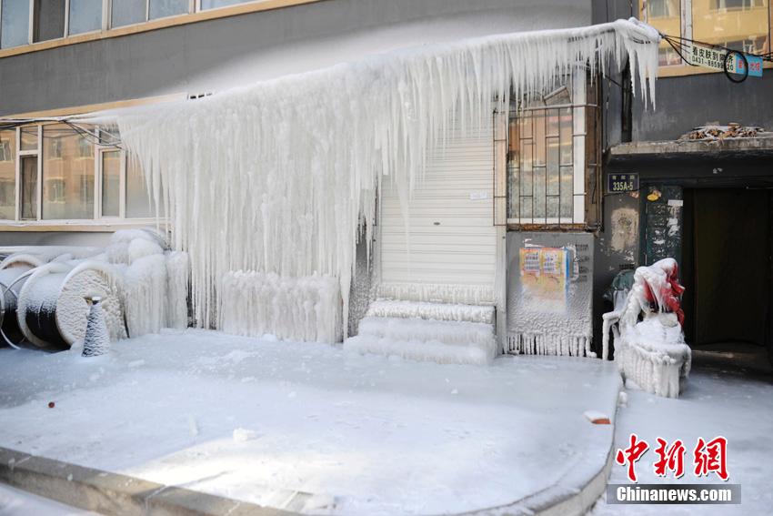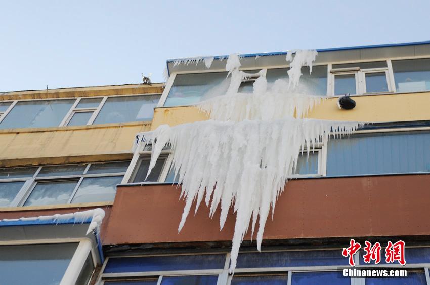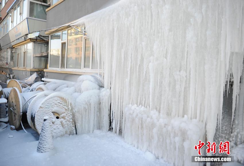 长春楼房外墙现巨型冰瀑近几日,在长春市一小区居民楼外墙上出现一片巨大的冰瀑,顶楼和一楼住户家的阳台、台阶和地面上都被一层厚厚的冰所覆盖。据附近居民讲,这片冰瀑是因楼顶太阳能热水器漏水,凝结所致。 张瑶 摄