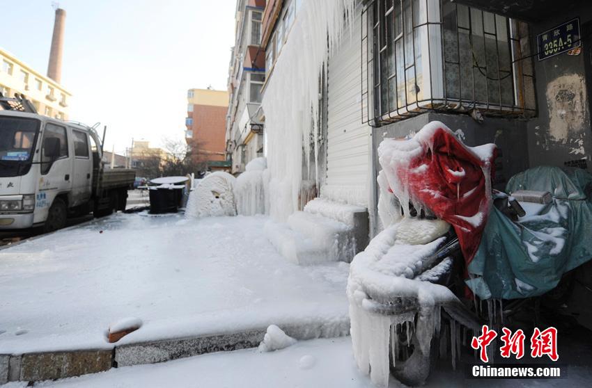 近几日,在长春市一小区居民楼外墙上出现一片巨大的冰瀑,顶楼和一楼住户家的阳台、台阶和地面上都被一层厚厚的冰所覆盖。据附近居民讲,这片冰瀑是因楼顶太阳能热水器漏水,凝结所致。图为停靠在楼边的摩托车也被冰所覆盖。 张瑶 摄