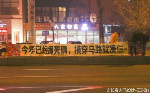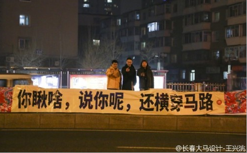 今天清晨4点左右,本地知名博主“长春西门大官人”发了一条微博,上面写着:警示条幅又来了,4月11号刚发生车祸路段,亚泰大街与南湖大路交会处,一群热心小伙子挂起条幅,“你瞅啥,说你呢,还横穿马路。今年已经撞死俩,横穿马路就凑仨”。同时还配上了几名男子在马路中间的栅栏上挂条幅的画面。这是既上个月在文庙附近出现的警示条幅后,长春街头又一次出现类似条幅。对此,有人支持,也有人认为,话虽然在理,但张贴条幅的行为有损城市形象。