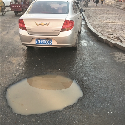 铁西区果园街与兴海路交汇处路面有坑积水。
