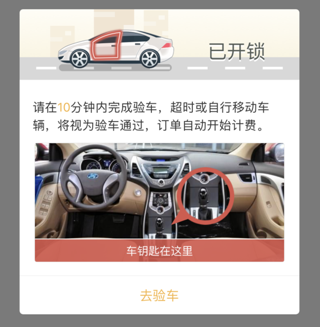 第三步,要去验车。开锁之后,页面上显示,请在10分钟内完成验车,超时或自行移动车辆,将视为验车通过,订单自动开始计费。当你点击验车之后,车辆已有问题将会自动显示,你只需要看看车辆是否有其他问题就可以了,整个过程仅需三分钟就OK。