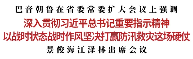 巴音朝鲁指出,习近平总书记高度重视防汛救灾工作,今年6月以来两次作出重要指示,充分体现了深厚真挚的为民情怀、生命至上的执政理念,为我们做好防汛救灾工作提供了根本遵循。当前,我省防汛救灾已进入关键阶段。各级党委、政府和有关部门必须把防汛救灾工作作为当务之急、重中之重,坚持底线思维,增强风险意识,坚决防止掉以轻心、麻痹大意,全面进入临战状态;必须立足防大汛、抗大洪、抢大险、救大灾,在思想、组织、物资、队伍等各方面做好一切应对准备,牢牢把握防汛救灾工作主动权;必须坚持把人民至上、生命至上作为第一原则、第一责任、第一目标,尽最大努力保障人民群众生命财产安全。