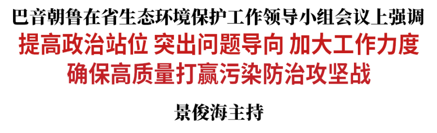 巴音朝鲁指出,当前,距离年底污染防治攻坚战收官仅剩两个月时间,各项任务已进入决战决胜的最后冲刺阶段。各级党委、政府必须进一步提高政治站位,把完成中央生态环保督察及“回头看”整改任务、实现污染防治攻坚阶段性目标作为增强“四个意识”、坚定“四个自信”、做到“两个维护”的具体行动和实际检验,紧抓不放、一抓到底,确保党中央关于生态文明建设和生态环境保护的各项决策部署落地生根、取得实效。必须进一步突出问题导向,聚焦今年全省决胜污染防治攻坚战目标任务,深入查找影响生态环境质量改善的关键问题、存在重大风险隐患的突出问题、涉及群众利益的棘手问题,盯住问题逐个攻破,以点带面整体推进,全力补齐生态环境保护短板。必须进一步加大工作力度,利用有效时间,精心组织安排,拿出时不我待、争分夺秒的拼劲干劲,全力推动各项措施提速增效、落实落地。